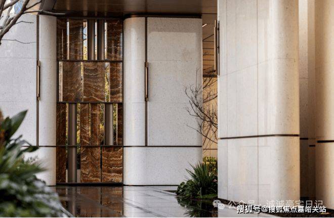 门庭延街的外立面,以精工定制弧形米色石材为主调,镶嵌典藏级老虎玉大理石,装饰古铜色摩登海派艺术感灯器,集体暴露出百年海派的贵雅气质。